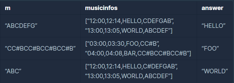 - musicinfos는 100개 이하의 곡 정보를 담고 있는 배열로, 각각의 곡 정보는 음악이 시작한 시각, 끝난 시각, 음악 제목, 악보 정보가 ','로 구분된 문자열이다.