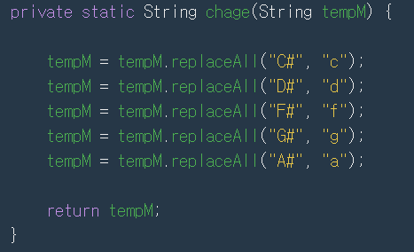 chage 메서드를 통해 C#, D#, F#, G#, A#을 c, d, f, g, a 로 변경해준다. '#'이 있기에 구분하기 때문에 소문자로 변경해준다. (네오가 기억한 멜로디를 담은 문자열 m)