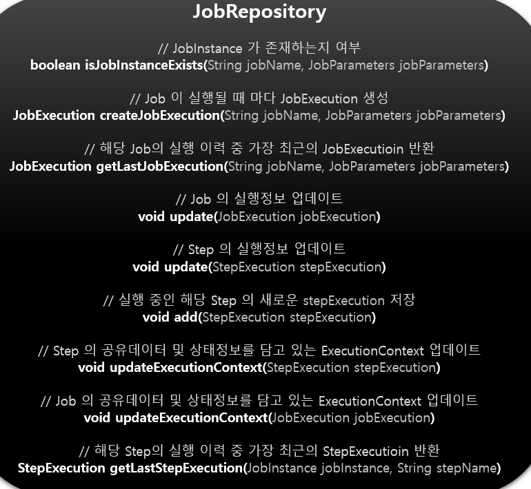 *JobLauncher, Job에서 JobInstance, JobExecution 등 또 Step도 StepExecution, StepExecutionContext와 같은 이런 여러가지 메타 데이터를 저장하는 시점마다 CRUD 기능들이 작동하는데 이때 JobRepository클래스가 각각의 단계마다 이런 데이터를 저장하고 업데이트 하고 조회하는 역할을 담당하고 있습니다.JobRepository는 메타데이터들을 저장하는 저장소 역할을 한다.