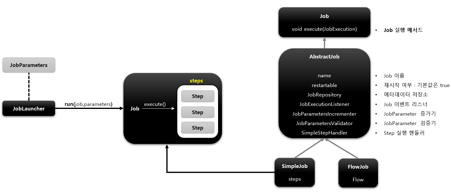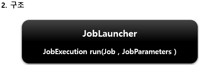 -Job과 Job Parameters를 인자를 받으며 요청된 배치 작업을 수행한 후 최종 client에게 JobExecution을 반환함