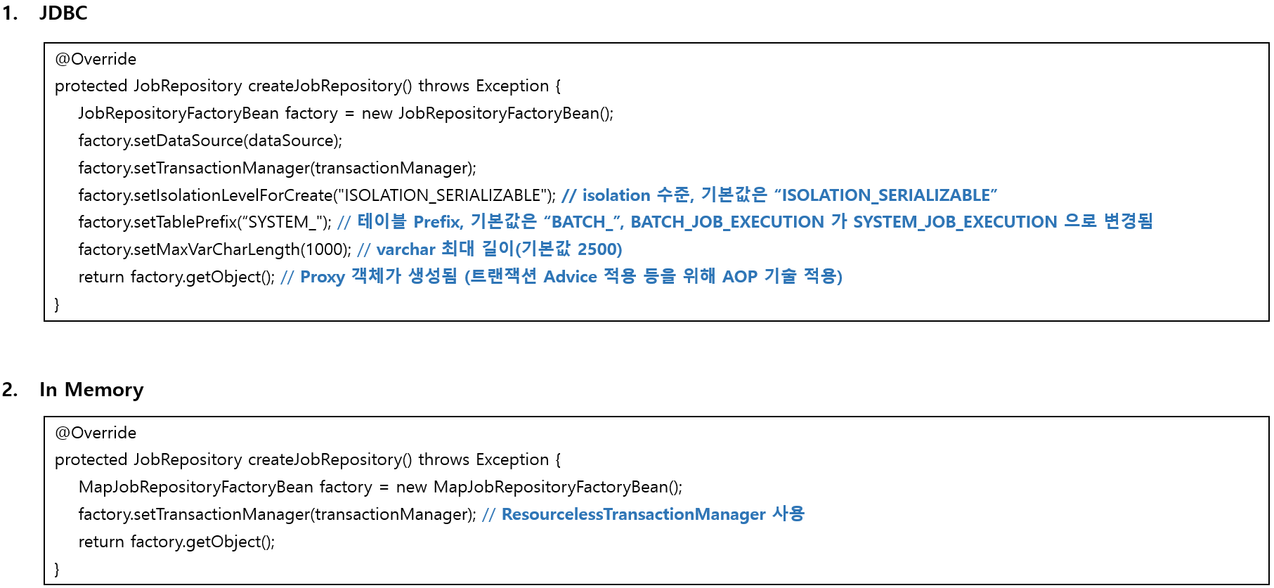 -BatchConfigurer 인터페이스를 구현하거나 BasicBatchConfigurer를 상속해서 JobRepository 설정을
