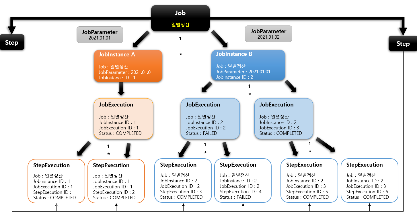 -JobInstance와 JobExecution는 1:M의 관계로서 JobInstance에 대한 성공/실패의 내역을 가지고 있음
