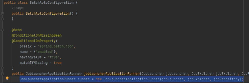BatchAutoConfiguration 에서 JobLauncherApplicationRunner ruuner가 이 클래스가 우리가 만든 잡을 실행시키는 클래스입니다.