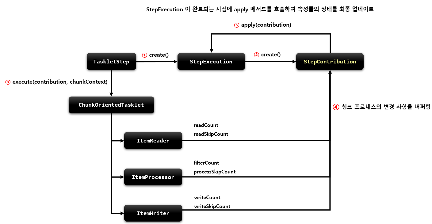(StepContribution이 가지고 있는 속성 값들을 apply 메서드를 호출해서 StepExecution에 업데이트 한다.)