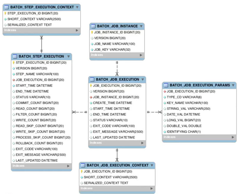 Job과 Step의 상태정보를 저장할 수 있는 테이블(스키마)을 스프링 배치에서 기본적으로 제공한다.