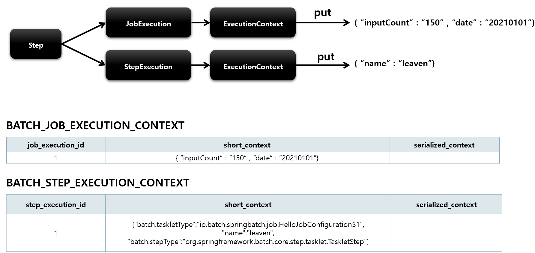 -Step의 실행동안 여러가지 상태정보, 공유 데이터를 직렬화(Json 형식) 해서 저장
