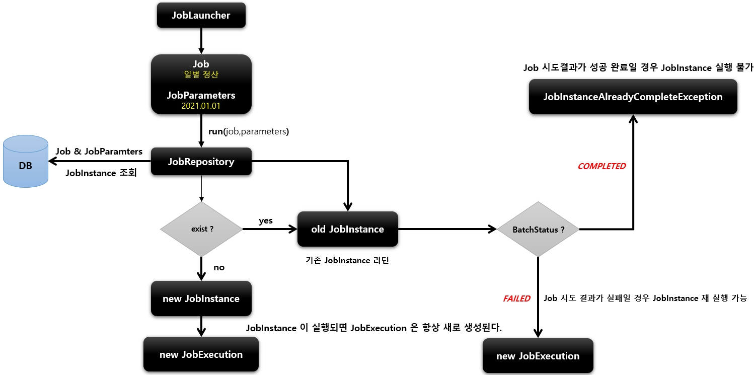 -JobExecution의 실행 상태 결과가 'COMPLETED'면 JobInstance 실행이 완료된 것으로 간주해서 재 실행이 불가함