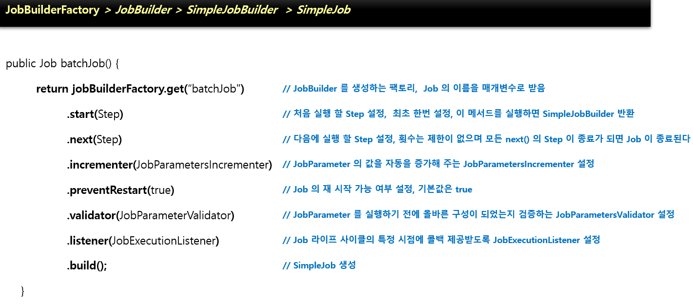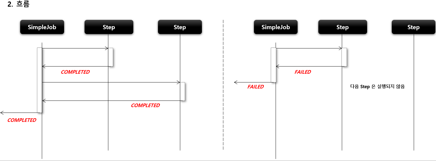 -SimpleJob은 Step을 실행시키는 Job 구현체로서 SimpleJobBuilder에 의해 생성된다.