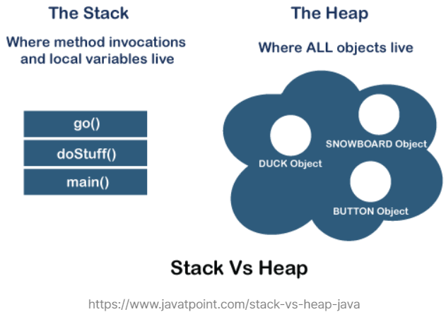 즉, 스택 메모리는 primitive 타입의 지역변수와 힙 공간에 있는 객체 참조 변수만 갖고 있다.